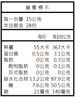 保存條件:請置於陰涼乾燥處,避免高溫、潮濕或陽光直射。開封後請儘速食用完畢,以保食品新鮮
